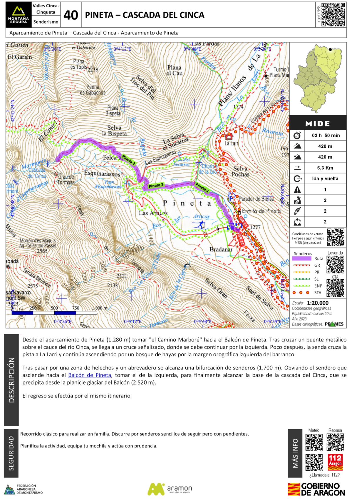 Descripción: Desde el aparcamiento de Pineta (1.280 m) tomar "el Camino Marboré" hacia el Balcón de Pineta. Tras cruzar un puente metálico sobre el cauce del río Cinca, se llega a un cruce señalizado, donde se debe continuar por la izquierda. Poco después, la senda cruza la pista a La Larri y continúa ascendiendo por un bosque de hayas por la margen orográfica izquierda del barranco.